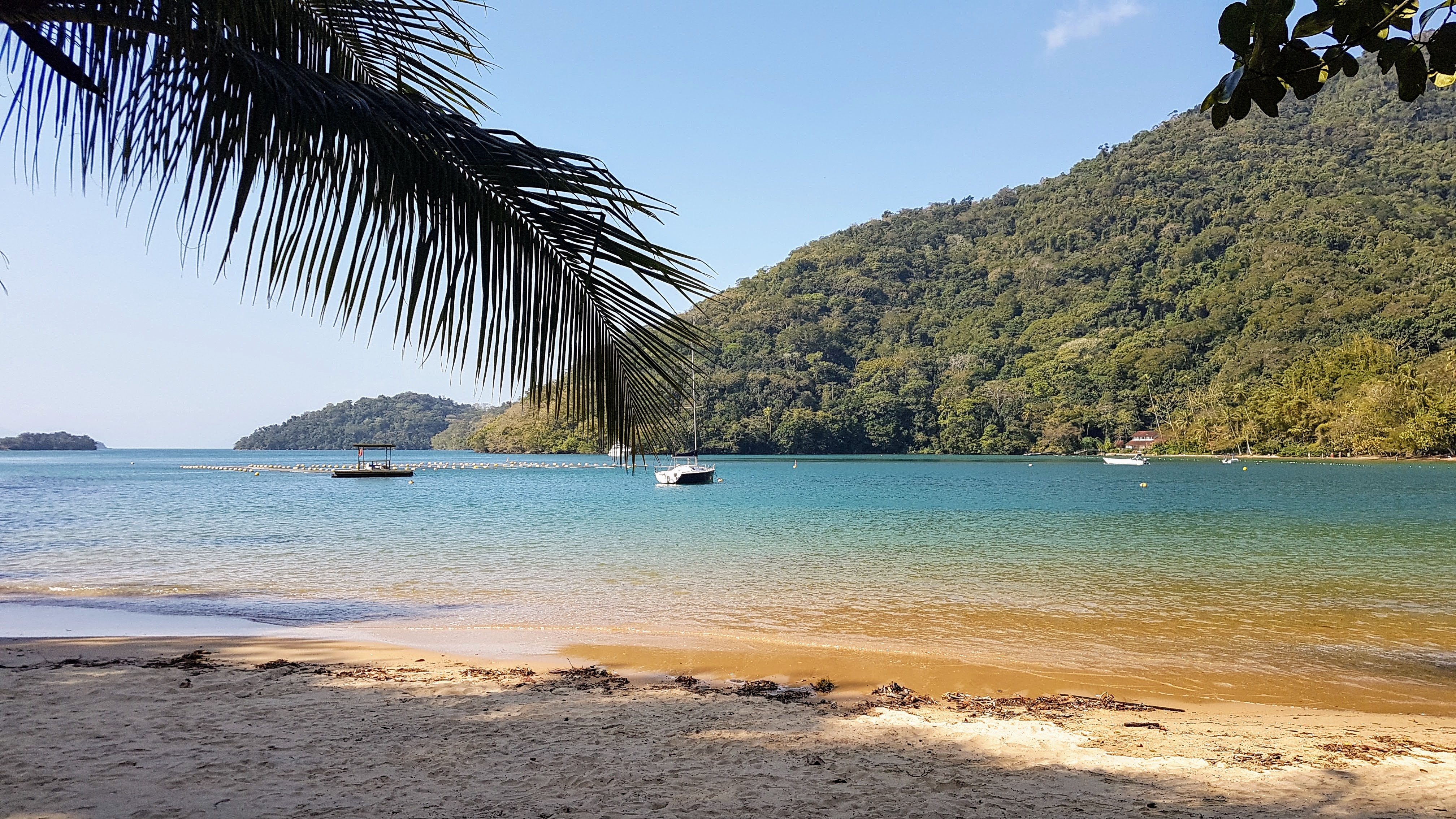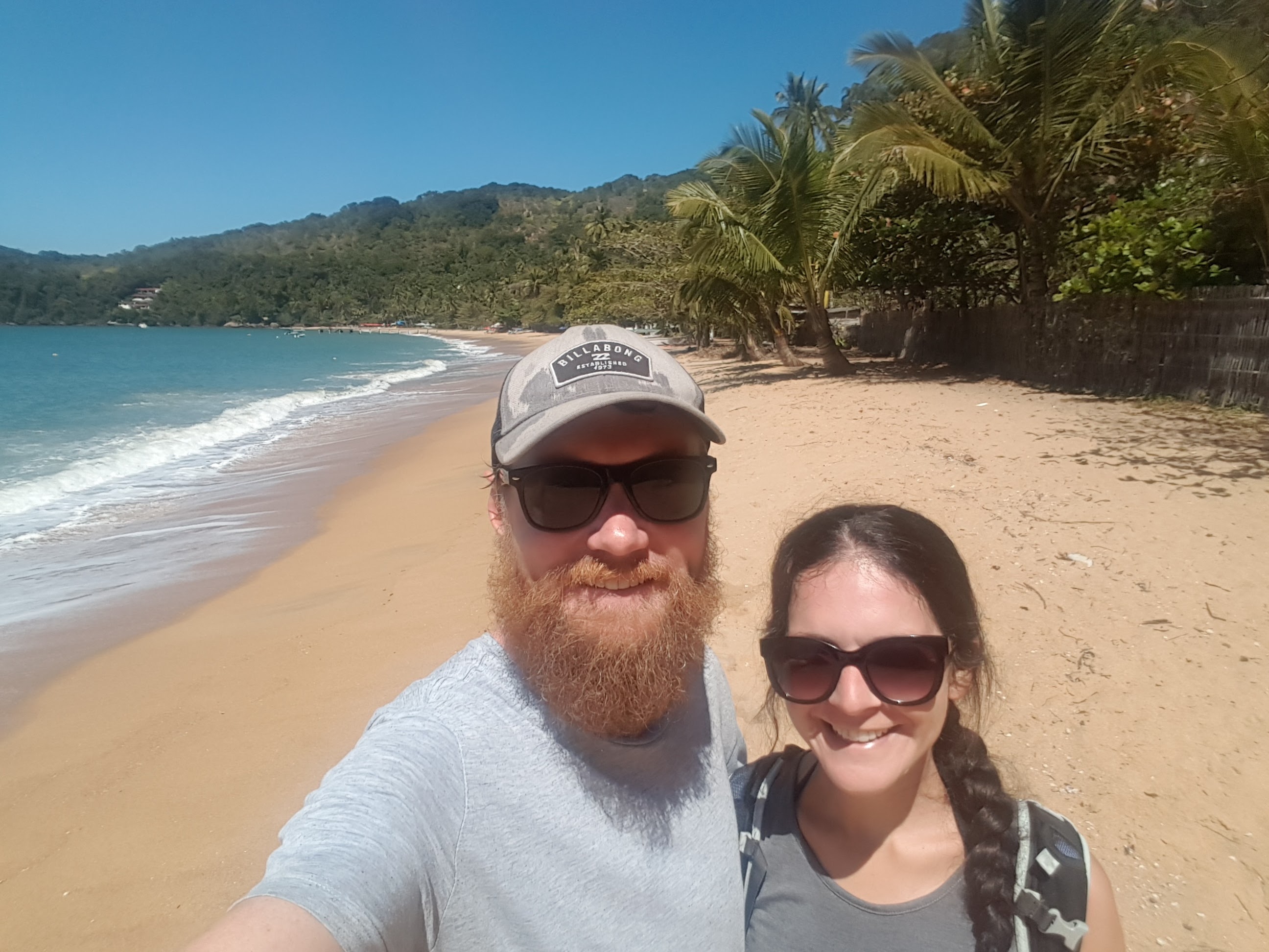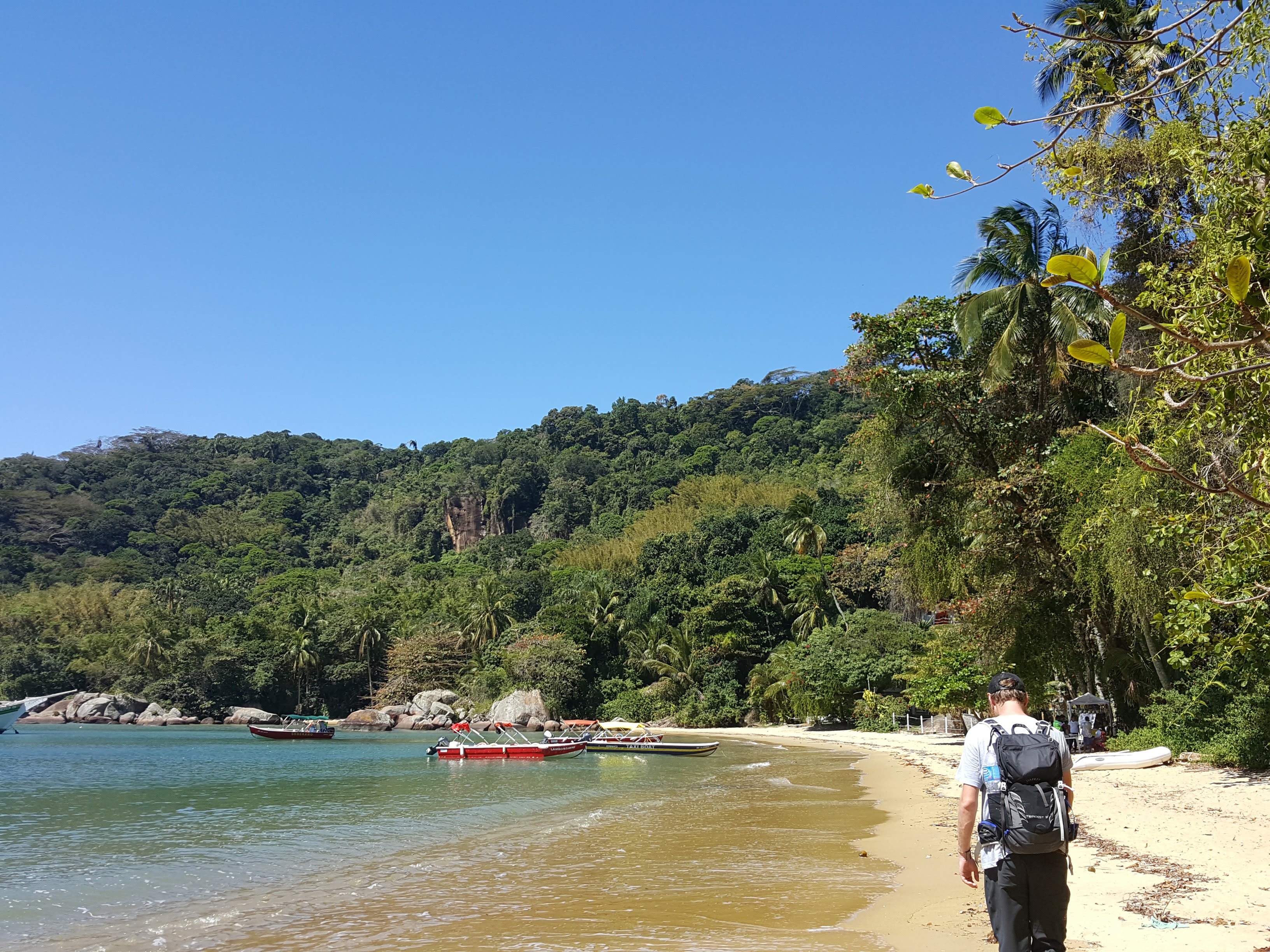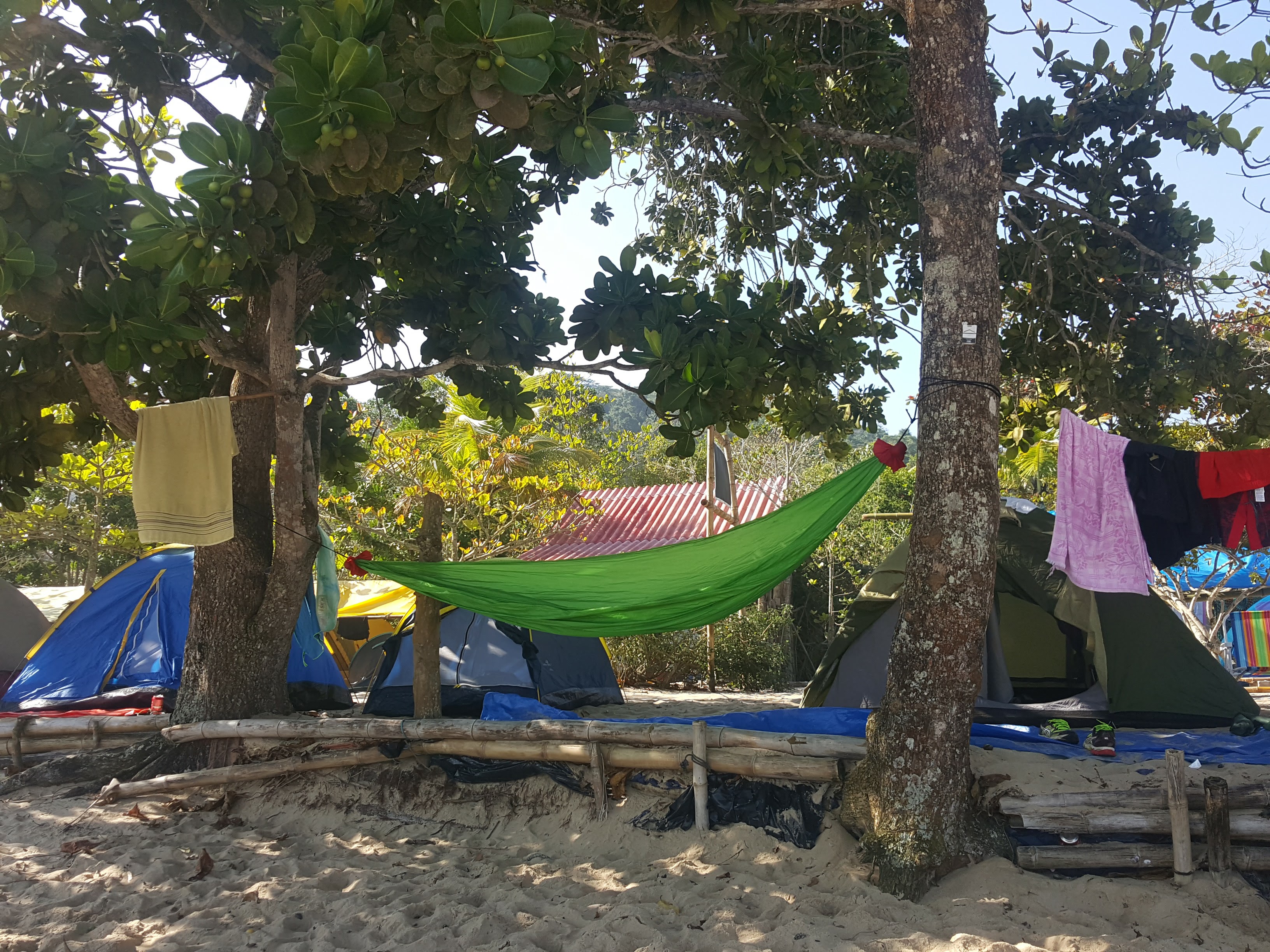 Although we’d already been spoiled by the beaches in Brazil we decided we needed to visit one more and headed for Praia do Sono. Google told me it was easy to get there – grab a local bus to the trail start at Laranjeiras and walk an hour and a half to a quiet beach! Google was wrong. The local bus station was pretty feral and we spent way too long trying to find out which bus to get. Fortunately after about 90 minutes we were on a bus to Oratoria, which is the correct name of the bus to look for. The hike was similar to those in Ilha Grande and very enjoyable. We passed a few people hiking in with full camping gear and once we arrived at Sona Beach we realised it is a really popular place to camp and party for the holiday. The beach was still stunning but had hundreds of tents and hammocks pitched and loaded with people chilling out by day and we assume partyinh by night.