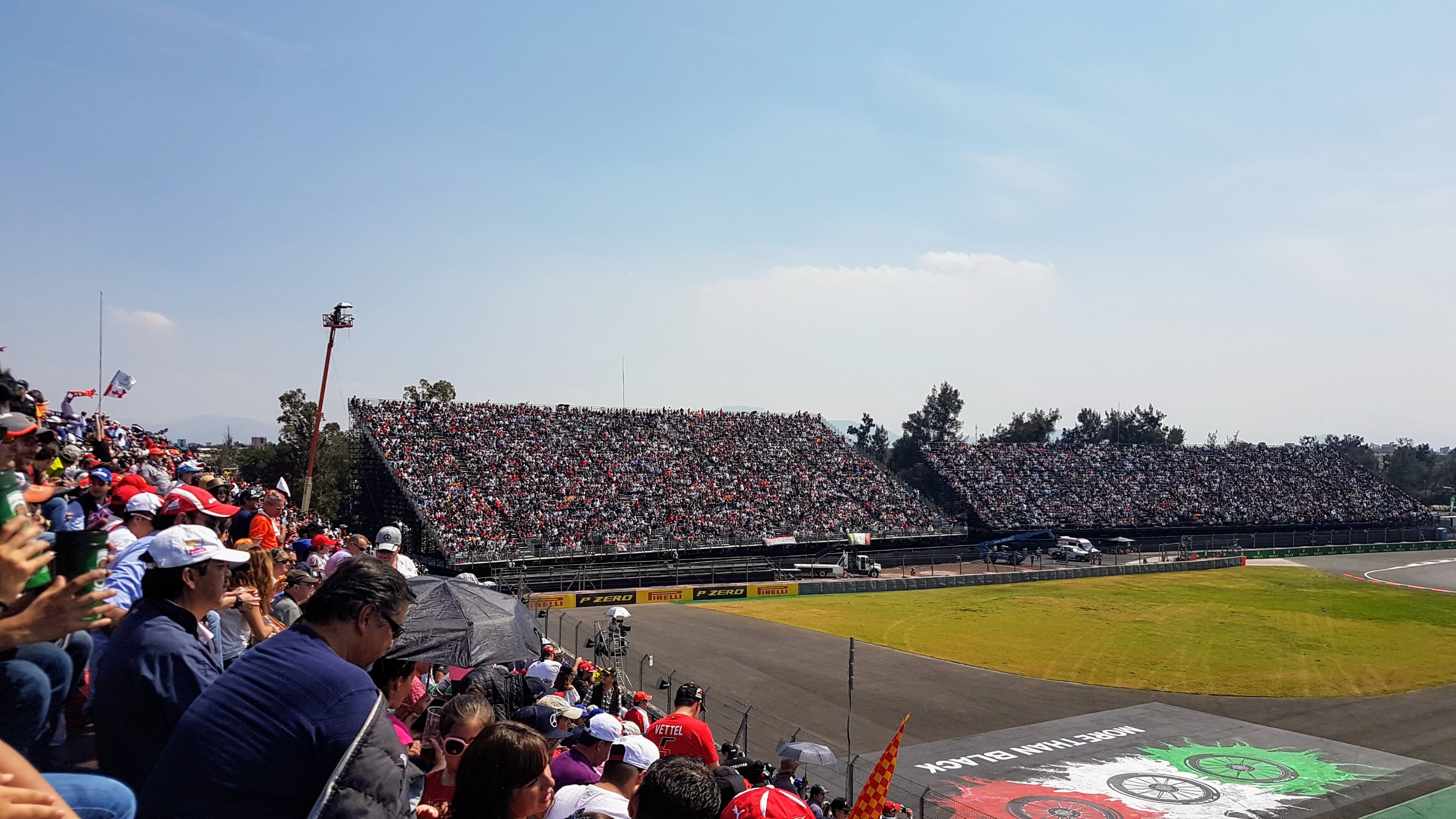 The race didn’t go as we hoped. Ricciardo had issues in quali, took a new engine overnight and somehow still had his engine die after seven laps. The two fighting for the world championship, Vettel and Hamilton hit each other on lap one so we saw plenty of activity as they fought back through the backmarkers – especially Vettel. Hamilton did enough (well actually Vettel didn’t do enough) to guarantee the world championship – sadly though they has no visible celebration for this after the race and as far as we could tell they didn’t even show the full podium presentation on the in circuit TVs. The real cheers during the day though were for the Mexican driver Perez who outperformed at his home race and kept the atmosphere in the stands buzzing until the end!